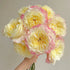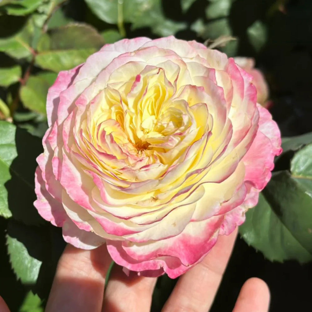 This charming rose has a rare light yellow color that feels soft, warm, and bright. As the flower opens and gets more sunlight, the yellow deepens and the edges turn a rich carmine red, slowly blending across the petals—like a gentle blush spreading, giving it a graceful and romantic look.