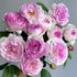 This lovely rose starts with spherical, milky white buds that open into soft pink-cream flowers with lavender hints, gradually turning purple as they mature. The blooms transition from a charming cup-shaped to elegant flat rosettes. This rose has strong pleasing fragrance. It blooms repeatedly throughout the seasons.