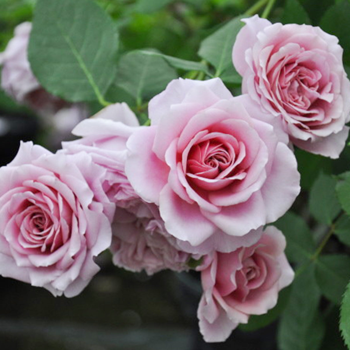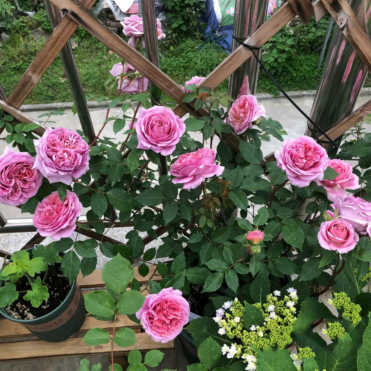 The flowers are pale pink with a hint of gray, forming rosette clusters. The tree shape allows for use as a semi-straight shrub rose or a small climbing rose. Even with hard winter pruning, it will still bloom. It's ideal for growing on a large pergola.