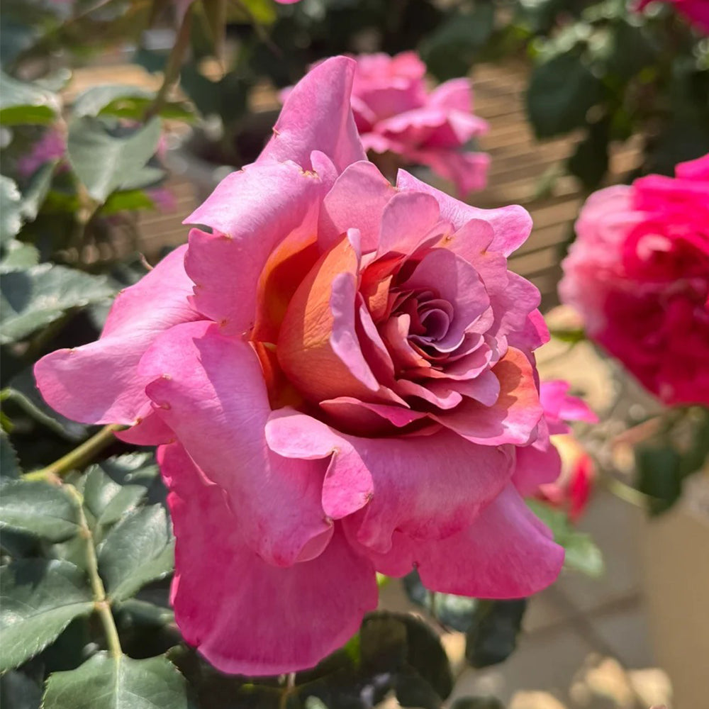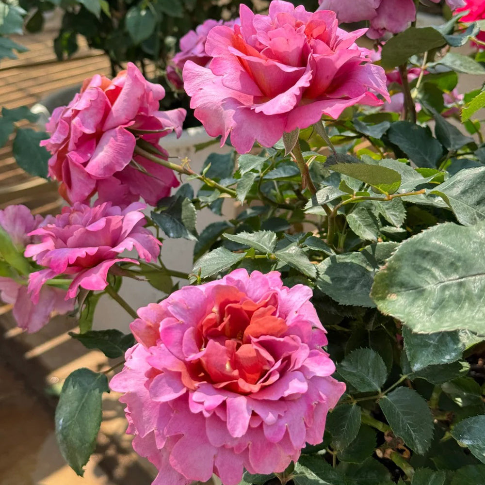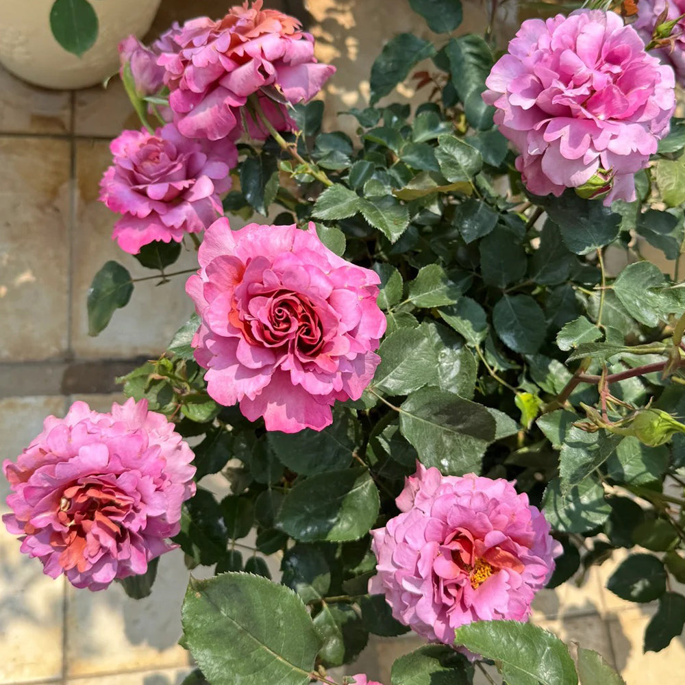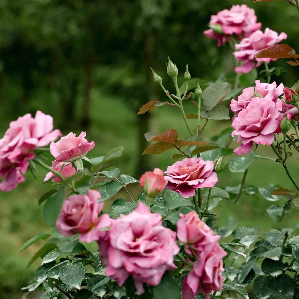 This enchanting rose boasts a unique blend of colors, including pink, purple, and brown, with blooms of varying shades appearing on the same plant. It features a compact shape, excellent re-flowering ability, and a delightful medium fragrance.