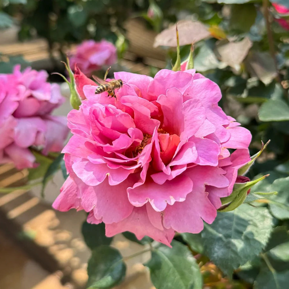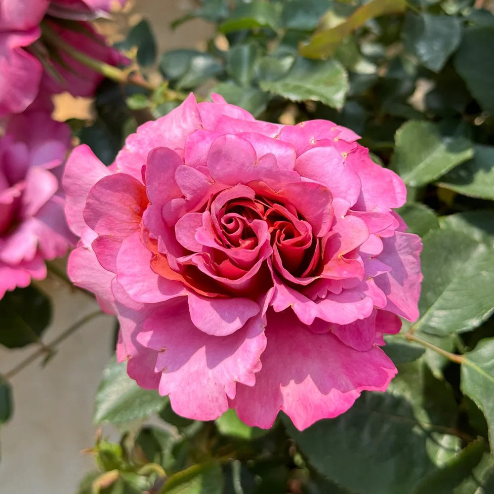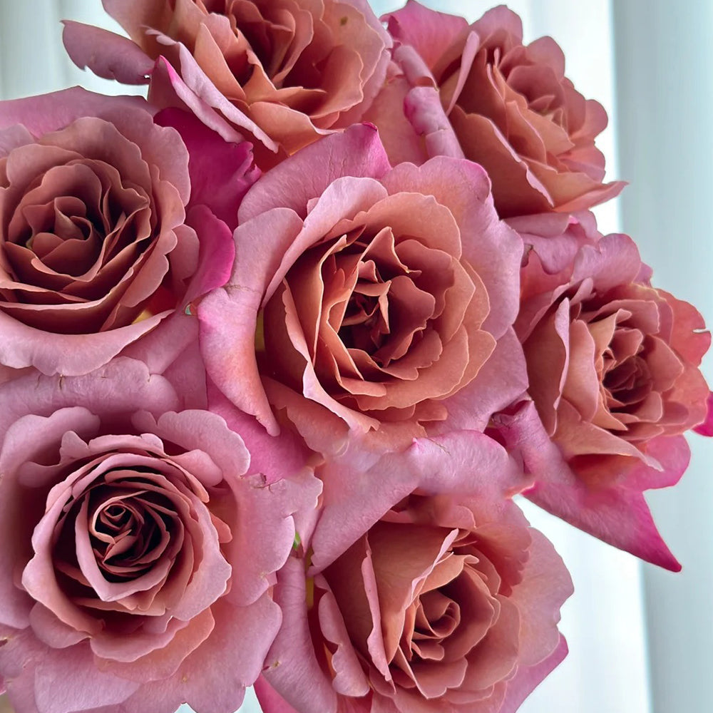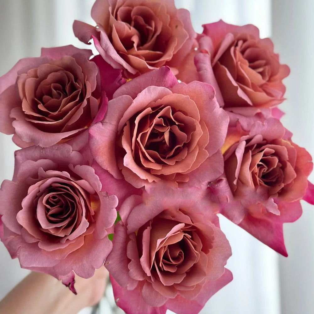 This enchanting rose boasts a unique blend of colors, including pink, purple, and brown, with blooms of varying shades appearing on the same plant. It features a compact shape, excellent re-flowering ability, and a delightful medium fragrance.