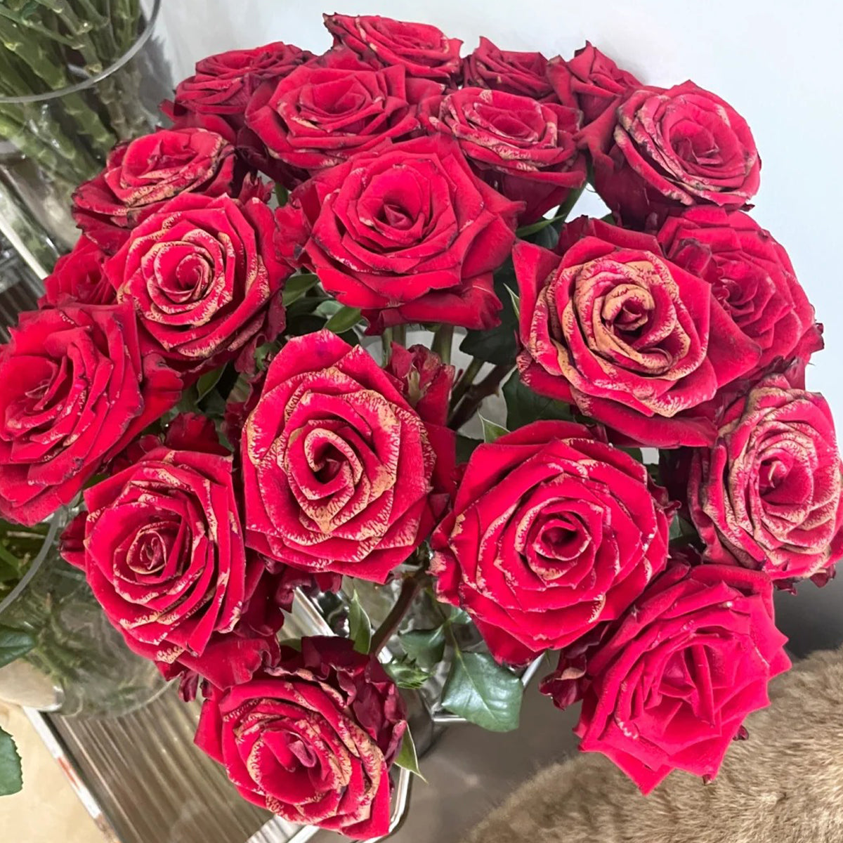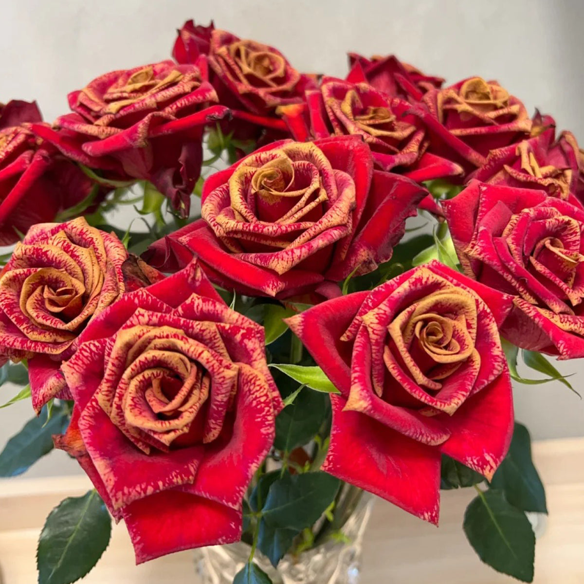 This unique rose displays bright red blooms with a hint of orange, velvety petals, and a beautifully cup-shaped form. Its thick petals ensure a long-lasting display, while the upright, sturdy plant with few thorns thrives in greenhouse or controlled environments.