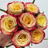 This unique rose features multi-colored blooms with champagne petals edged in red or pink. Its high, cup-shaped form and wavy petals create a refined, elegant look. The thick petals offer long-lasting beauty, making it a standout in any garden or arrangement.